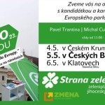 2. 5. 2014 | Zveme vás na diskusi s kandidátkou a kandidáty do Evropského parlamentu, Hankou Gabrielovou, Pavlem Trantinou a Michalem Cucem. Popovídat si s nimi můžete v našem zeleném obýváku na Náměstí Míru v Klatovech už v úterý 6.5. od 11:00 do 18:00 více»